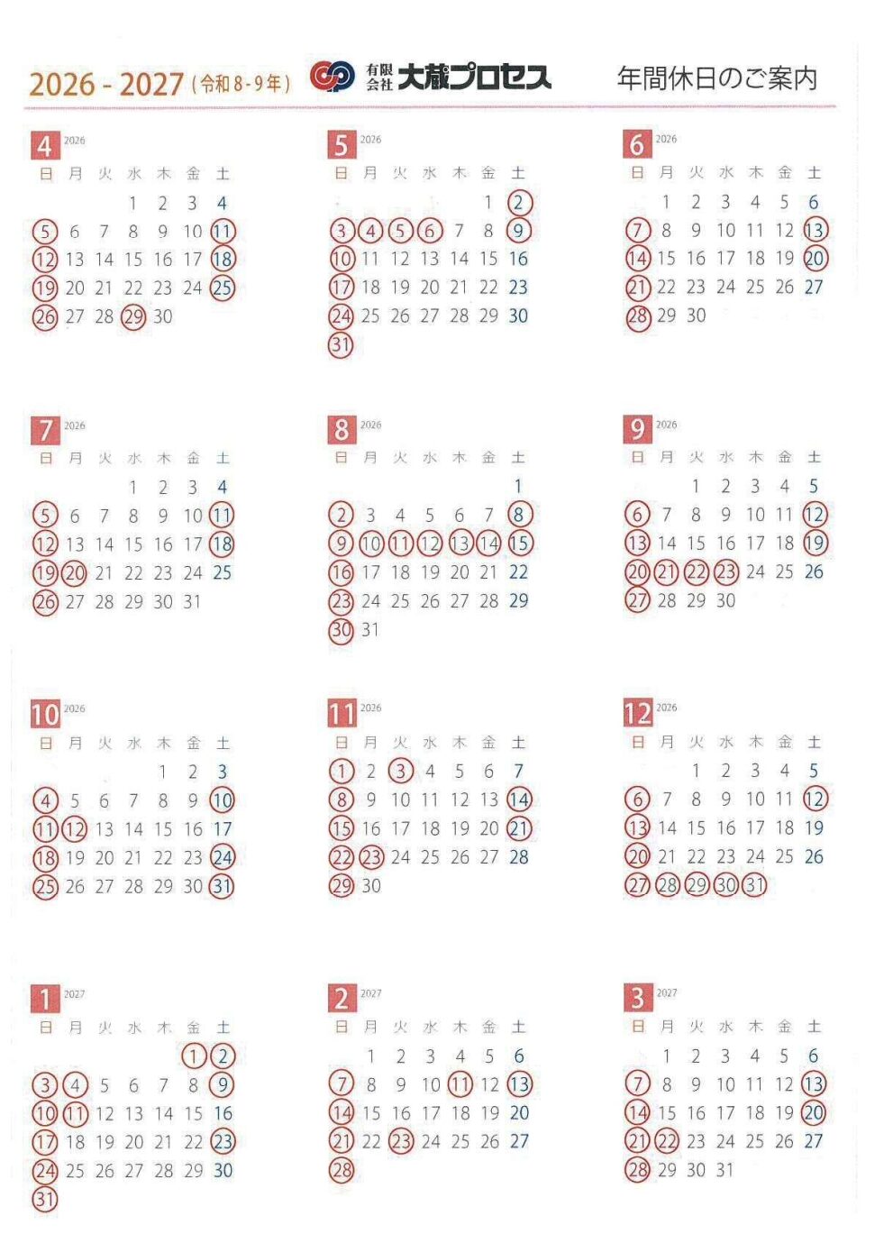工場カレンダーのお知らせ|大型シルクスクリーン印刷、大型インクジェット出力、塗画(手書き)|有限会社大蔵プロセス