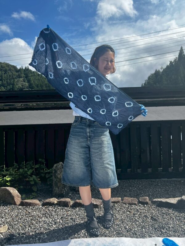 染め上がった布を見せ合いながら、「すごい!」「きれいにできたね!」と歓声が上がりました!
